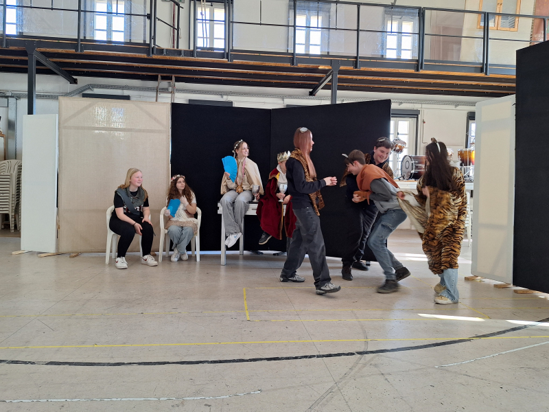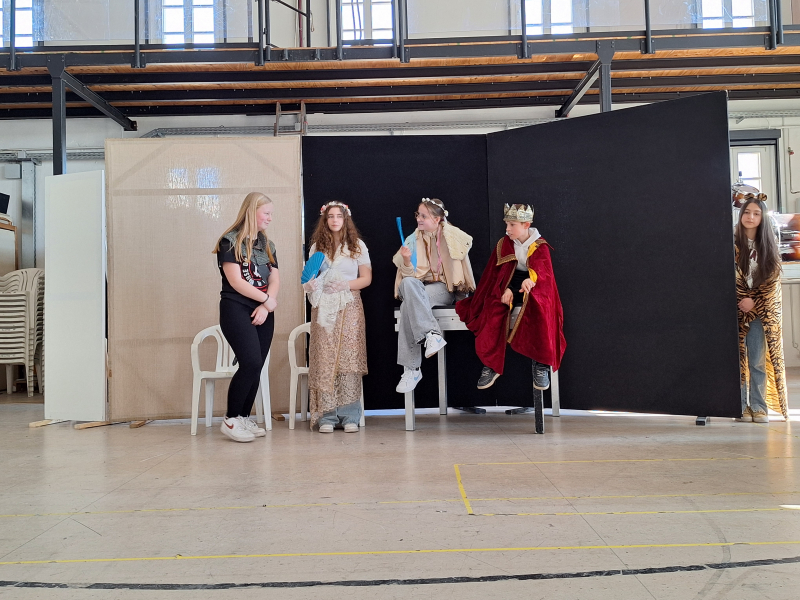 Nach der Führung ging es kreativ weiter: In einem Schauspiel-Workshop zur Ballade "Der Handschuh" konnten die Schülerinnen und Schüler selbst aktiv werden. Unter der Anleitung des erfahrenen Theaterpädagogen Herrn Michael Schmidt schlüpften sie in verschiedene Rollen und erarbeiteten gemeinsam eine eigene Inszenierung. Neben den klassischen Rollen wie Ritter und König gab es auch Moderatoren, Bühnengestalter und viele weitere Aufgaben, die von den Schülerinnen und Schülern mit Begeisterung übernommen wurden.